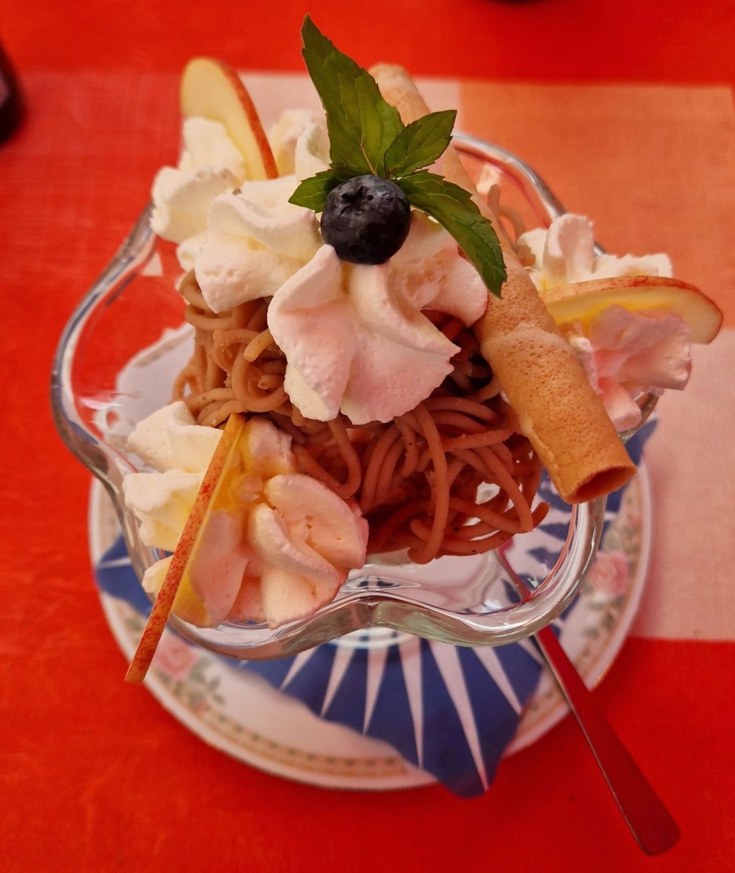 Das Dreieck ist fast geschlossen. Der letzte Schenkel führt uns zu Fuss in die Gartenbeiz. Nun werden die am Parkplatz verbliebenen Autos geholt. Kurz darauf sitzen wir bei Bier, Kaffee und Vermicelle wieder alle zusammen. Auch mit der Wahl der Beiz kann Hampe punkten: Es war vorzüglich. So lassen wir den fast sommerlichen Tag gemütlich ausklingen.