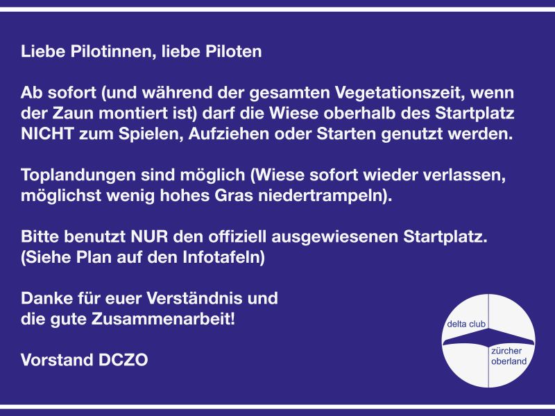 Ab sofort (und während der gesamten Vegetationszeit, wenn der Zaun montiert ist) darf die Wiese oberhalb des Startplatz NICHT zum Spielen, Aufziehen oder Starten genutzt werden.