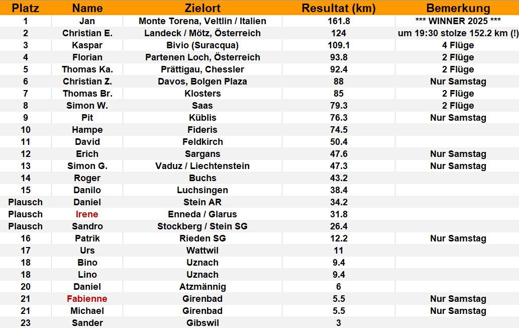 Ich gratuliere allen zu ihren Leistungen! Ihr habt ja absolut grossartige Strecken geflogen! Solche Distanzen sind auch bei guten Bedingungen nie einfach. Vielen Dank, Thomas, für die super Organisation! :-)