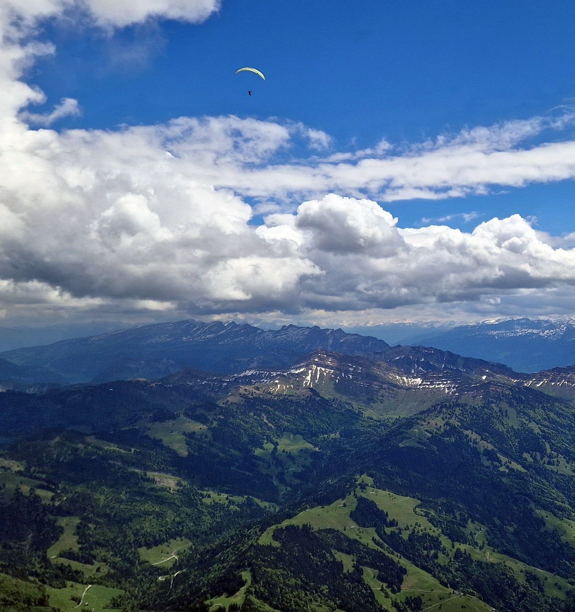 Wir treffen uns in Wald, ich bin gespannt auf die kommenden zwei Tage. Bereits morgens stehen grosse Cumuli am Himmel. Ein gutes Zeichen oder schon zu viel? Nach dem gemeinsamen Aufstieg zur Alp Scheidegg weht dort ein schöner Südwest-Wind. Ich freue mich schon, noch etwas zu handeln... Leider schattet es bald ab, Wind und Thermik schlafen ein. Eine sonnige Phase ermöglicht einigen Piloten aufzudrehen. Fritz zeigt als Erster, dass es geht, und Jochen, mit dem ich oft unterwegs bin, erreicht auch rasch eine schöne Höhe. Ich bin leider nicht rechtzeitig bereit und verpasse, wie einige andere, dieses Fenster.