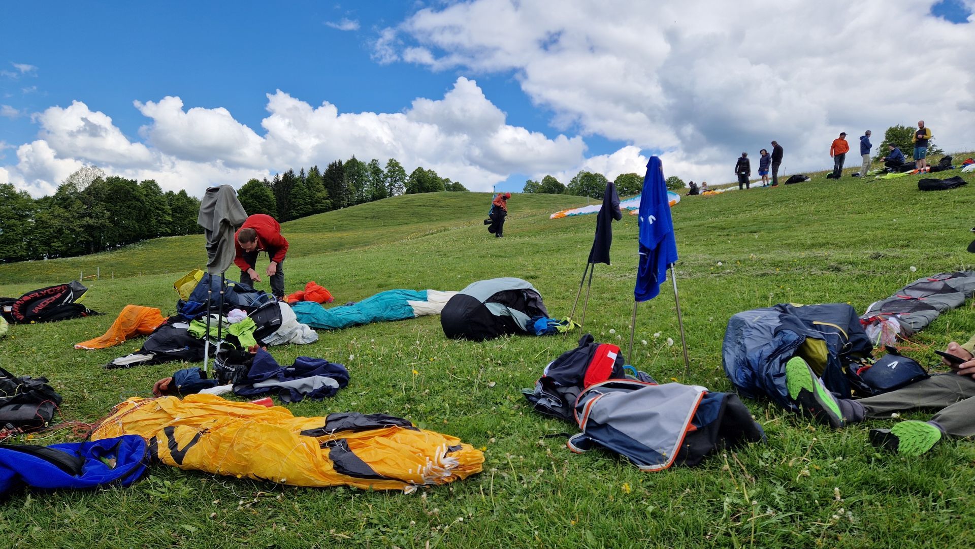 Oben angekommen, wäre meines Erachtens grad eben ein guter Startzyklus gewesen, aber bis alles bereit war, hatte es wieder großräumig abgeschattet. Aus wettkämpferischer Sicht wäre sicher sinnvoll gewesen, diese Zeit für die Routengestaltung zu nutzen, doch auch das Wiedersehen mit diversen Piloten war spannend.