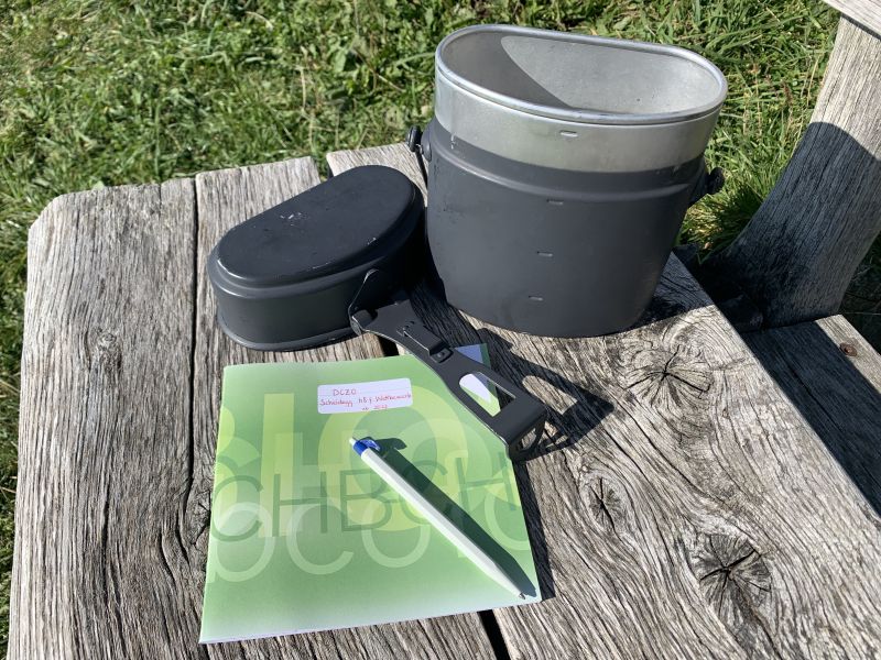 Unter dem Deckel der Sitzbank auf dem Startgelände befindet sich eine Militär – Gamelle.
